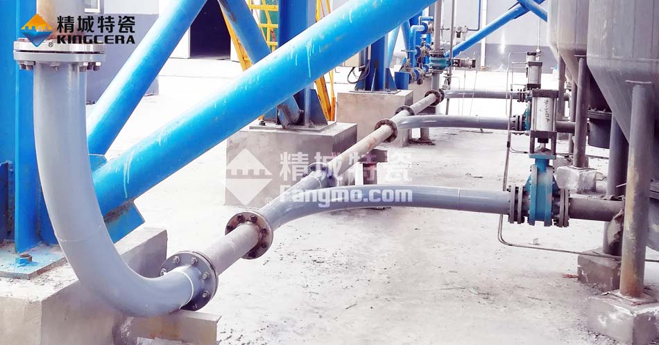現如今使用精城牌耐磨陶瓷片作為內襯材料,優點突出,耐磨陶瓷片本身硬度高,韌性強,很規則,每小塊之間用膠粘接,每一圈陶瓷片都進行錯位粘貼,做到無縫隙,杜絕瓷片間縫隙處被磨漏。管件之間的對接采用法蘭連接,便于安裝和更換,現已取得了良好的效果。