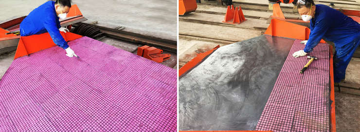 到現場后我們馬上開始了前期的勘察,工作環境不好,所有設備都裸露在車間內,吊車、重工設備來來往往,極為危險。準備工作剛開始就遇到了一個難題:所有的設備都已經涂滿了油漆。要想更好地安裝好耐磨陶瓷橡膠復合襯板,我們需要將表面所有油漆全部打磨掉,前期處理任務重、時間長。