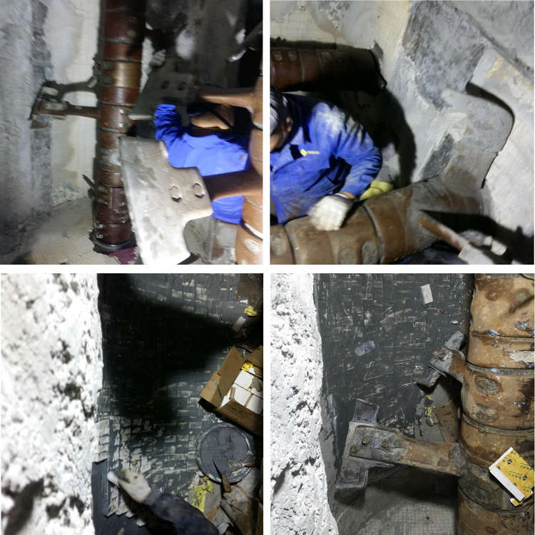 湖北某攪拌站2014年在我公司采購一批混凝土攪拌機耐磨陶瓷襯板,并由我公司現場施工安裝,攪拌機耐磨陶瓷襯板設計使用壽命3年或產量達60萬方,而實際使用壽命達到4年產出量約80萬方,耐磨性能及產量輸出遠超實際設計磨損。這次修復主要針對磨損嚴重及其損壞部件,精城公司安裝隊結合多年的應用經驗及企業自身的加工優勢,使用精細工藝與耐磨材料相結合的修復方案。即采用高耐磨精細氧化鋁陶瓷加超強陶瓷金屬粘合劑在攪拌機內重新打磨粘貼,對磨損嚴重部位重新加工加固,缺損部位及磨損區域全部更換陶瓷襯板,力保滿足使用要求。
