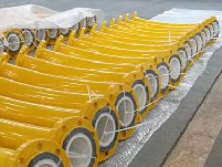 工業耐磨陶瓷橡膠硫化襯板在硫化的時候,會需要經過一道工序,就是噴膠。一直以來,噴膠這道工序都是由人工操作,穿上防水服,帶上防毒面具,手持噴槍操作,